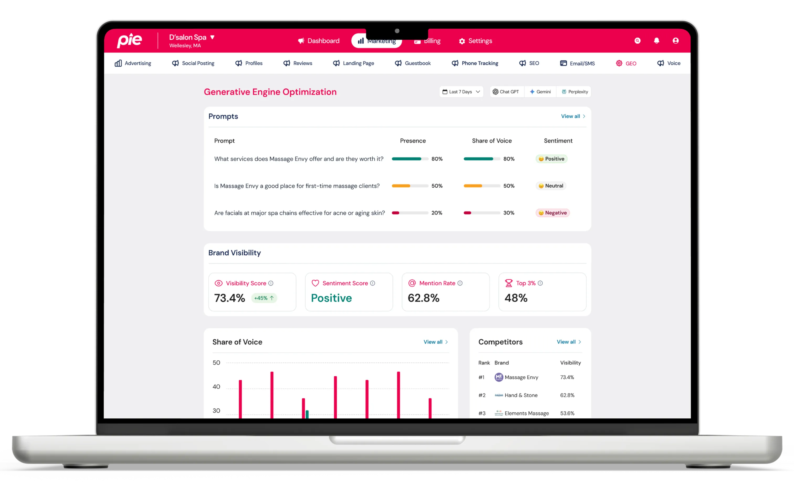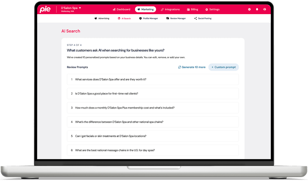 Pie automatically reviews and suggests improvements to the structure and content of your Google Business and Yelp profiles to make sure your business is represented in AI search answers. Make updates and track your visibility, mentions, traffic, and more over time.
